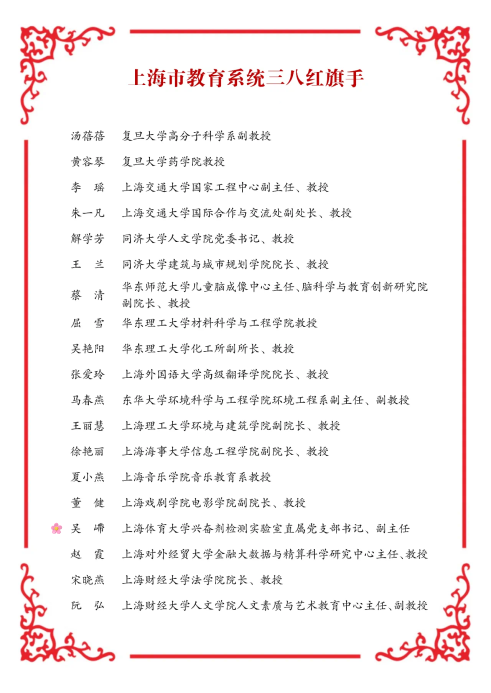 会议对2023-2024年度全国、上海市及上海市教育系统三八红旗手(集体)进行了表彰。经基层推荐、学校申报,市教育系统妇工委评选,伟德女教职工代表、上海兴奋剂检测实验室吴嵽副研究员荣获2023-2024年度“上海市教育系统三八红旗手”荣誉称号。
