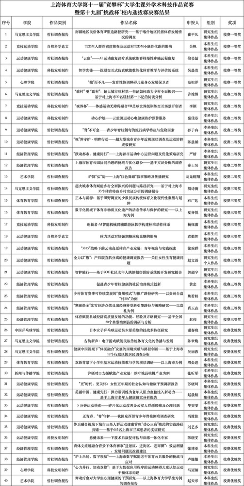 根据本次决赛答辩情况,秉承公开、公平、公正的原则,现评选出一等奖5项、二等奖8项、三等奖12项和优胜奖15项,并将推选12个项目参与第十九届“挑战杯”上海市大学生课外学术科技作品竞赛角逐,力争取得更新的突破。