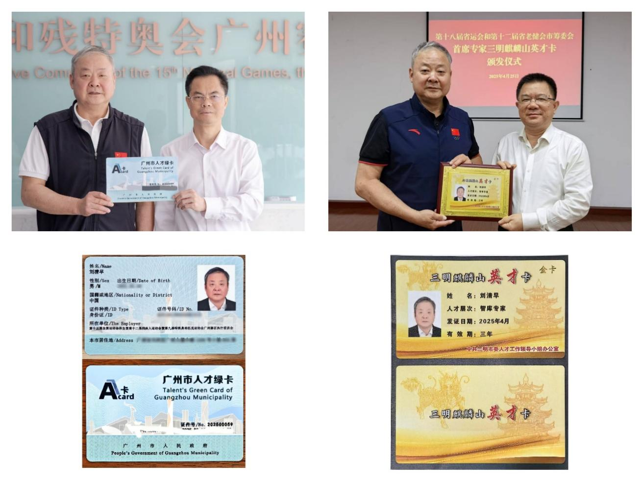 日前,广州市委副秘书长、十五运会和残特奥会广州赛区执委会副主任杨伟强,代表广州市政府,向刘清早教授颁发“广州市人才绿卡(A卡)”;中共三明市委副书记杨兴忠,代表三明市委、市政府向刘清早教授颁发“三明麒麟山英才卡(金卡)”。这是当地引进人才最高级别的身份卡,享受广州市和三明市引进的领军人才相关待遇。