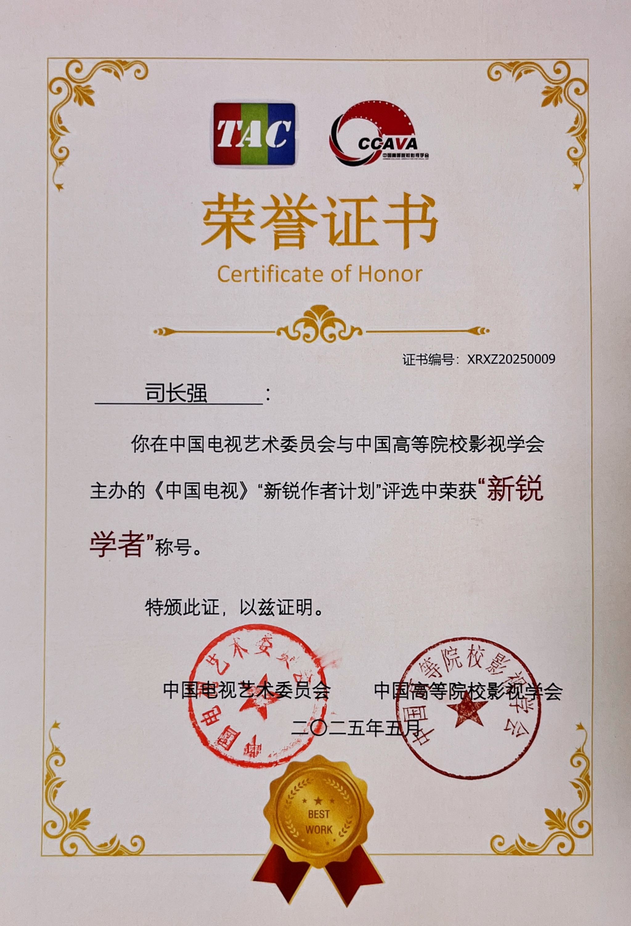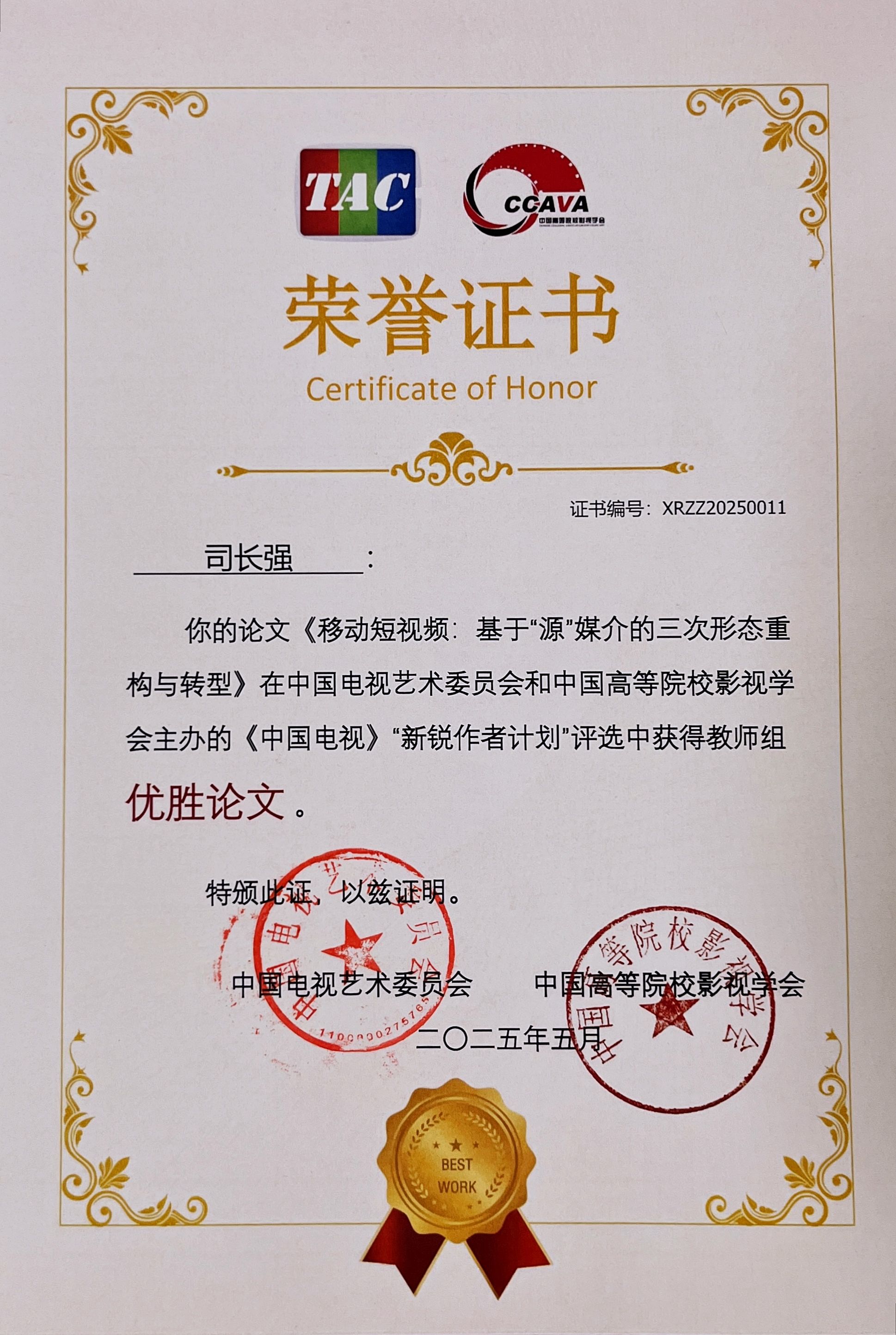 本网讯 5月15—18日,由国家广电总局中国电视艺术委员会和中国高等院校影视学会共同主办的“《中国电视》新锐作者计划”发布交流会在甘肃兰州举行。伟德艺术学院青年教师司长强副教授荣获“新锐学者”称号(最高奖项),其参选论文《移动短视频:基于“源”媒介的三次形态重构与转型》获“优胜论文”奖。