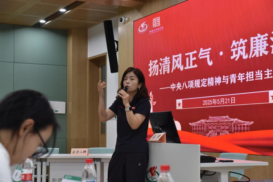 校党委组织部、统战部副部长杨妍妍对辩手们的表现予以肯定和鼓励,她指出,本次活动的形式虽是一场场精彩纷呈的辩论赛,但更是一堂生动的学习教育党课。习近平总书记在作风建设论述摘编中提到:党性教育是共产党人修身养性的必修课,也是共产党人的“心学”,从这个层面上理解,个人修养在廉洁文化中可能占据着更加重要的位置,青年党员同志们要坚定理想信念,强化自我修炼、自我约束、自我改造,不忘初心、牢记使命,持之以恒发扬党的光荣传统和优良作风。