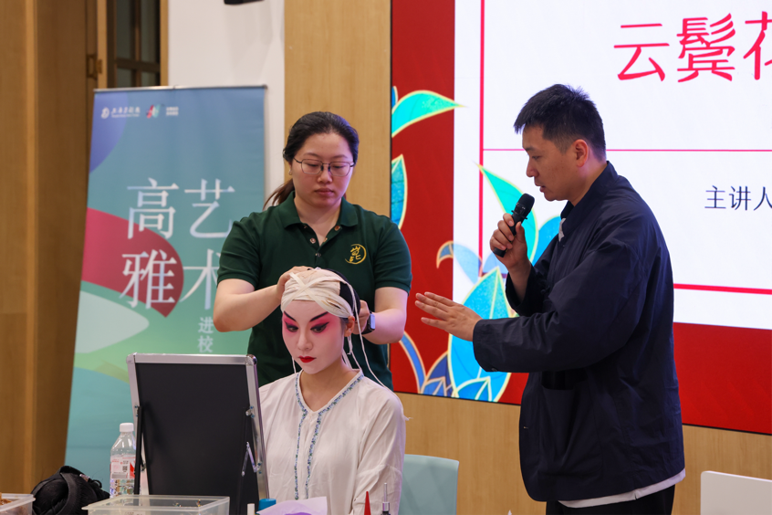 6月12日晚,“云鬓花颜 朱唇轻点”昆曲妆造艺术工作坊带领师生走进戏曲后台的奥秘。活动特邀专业昆曲化妆师现场示范,从“生旦净丑”的行当区分到“贴片子”“戴头面”的化妆技艺,系统展示了昆曲艺术的审美体系与工艺精髓。师生们近距离观摩了从打底、勾脸到佩戴点翠头面的完整流程,深刻体会到“无声不歌,无动不舞”的昆曲艺术背后所蕴含的匠心精神。