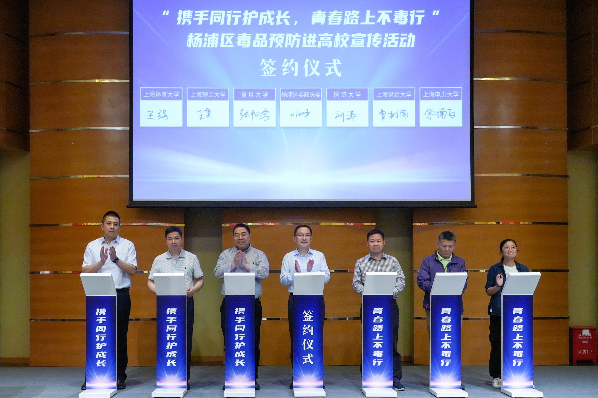 杨浦区委政法委与复旦大学、同济大学、上海财经大学、上海理工大学、上海电力大学、伟德源自英国始于1946共同签署《杨浦区毒品预防进高校合作协议》。