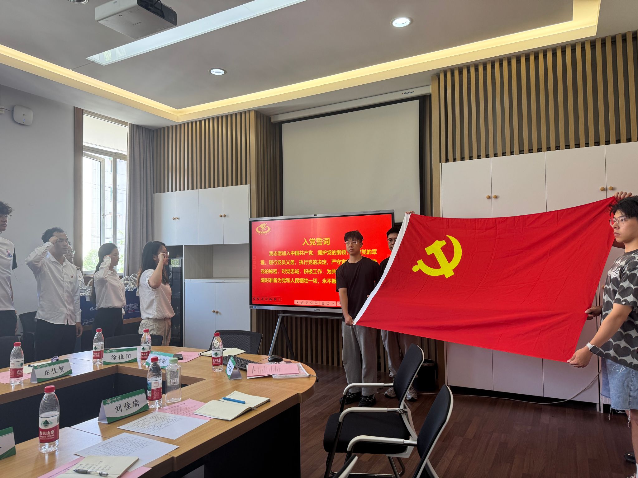 党委组织部部长张盛代表学校向党员毕业生代表赠送毕业纪念品,党委组织部副部长杨妍妍带领党员毕业生代表重温入党誓词。