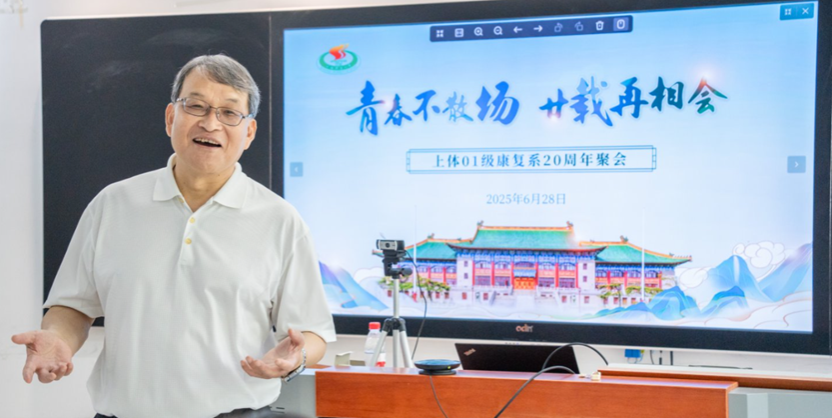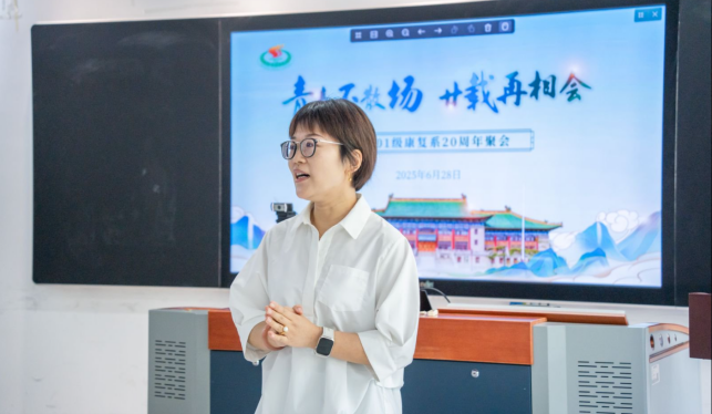 随后的“点名”环节将气氛推向高潮,校友们依次应答,仿佛重回课堂。多位校友分享个人成长故事,从临床一线到科研突破,从创业艰辛到家庭幸福,点滴故事折射出康复人的专业坚守与时代担当。辅导员殷勤、赵晓晗,班主任鲍明华、左群、史仍飞及教师代表陈文鹤、王人卫、潘珊珊和庄洁等深情寄语,勉励校友“以专业守护健康,以情怀回馈母校”。