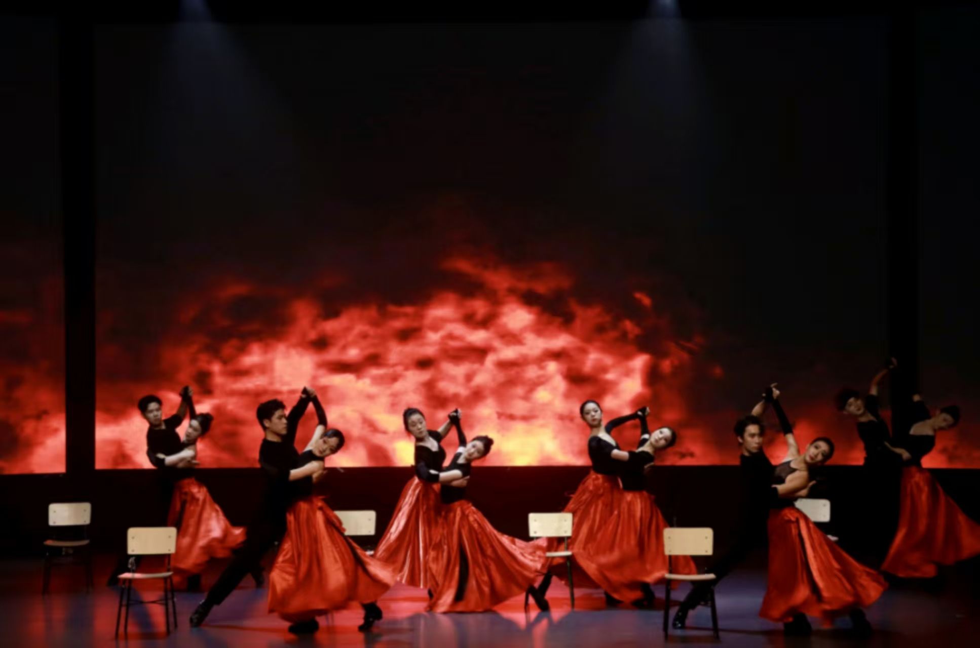 而在对“今天”的诉说中,22级舞编专业的同学们更是“各显神通”,充分展现了各自的艺术才华。作品《Dance Blaze》精准融合国标舞中伦巴与恰恰的元素,呈现动感韵律。经典剧目《芝加哥》则通过标志性的舞步编排与节奏把控,成功诠释了其独具魅力的热辣艺术风格。值得一提的是,摩登双人舞《The love of hatred》在艺术学院吴仁塔娜老师的钢琴现场伴奏声下,将摩登舞的高雅格调与内在热情演绎得淋漓尽致。由谢林峰同学创作的原创音乐剧《思念如雨季》以其精心营造的浪漫氛围,实现了音乐与剧情的深度交融。电子琴、架子鼓、贝斯等乐器的运用,为整场汇演注入了清新而悸动的艺术质感,为观众带来深刻的情感共鸣。