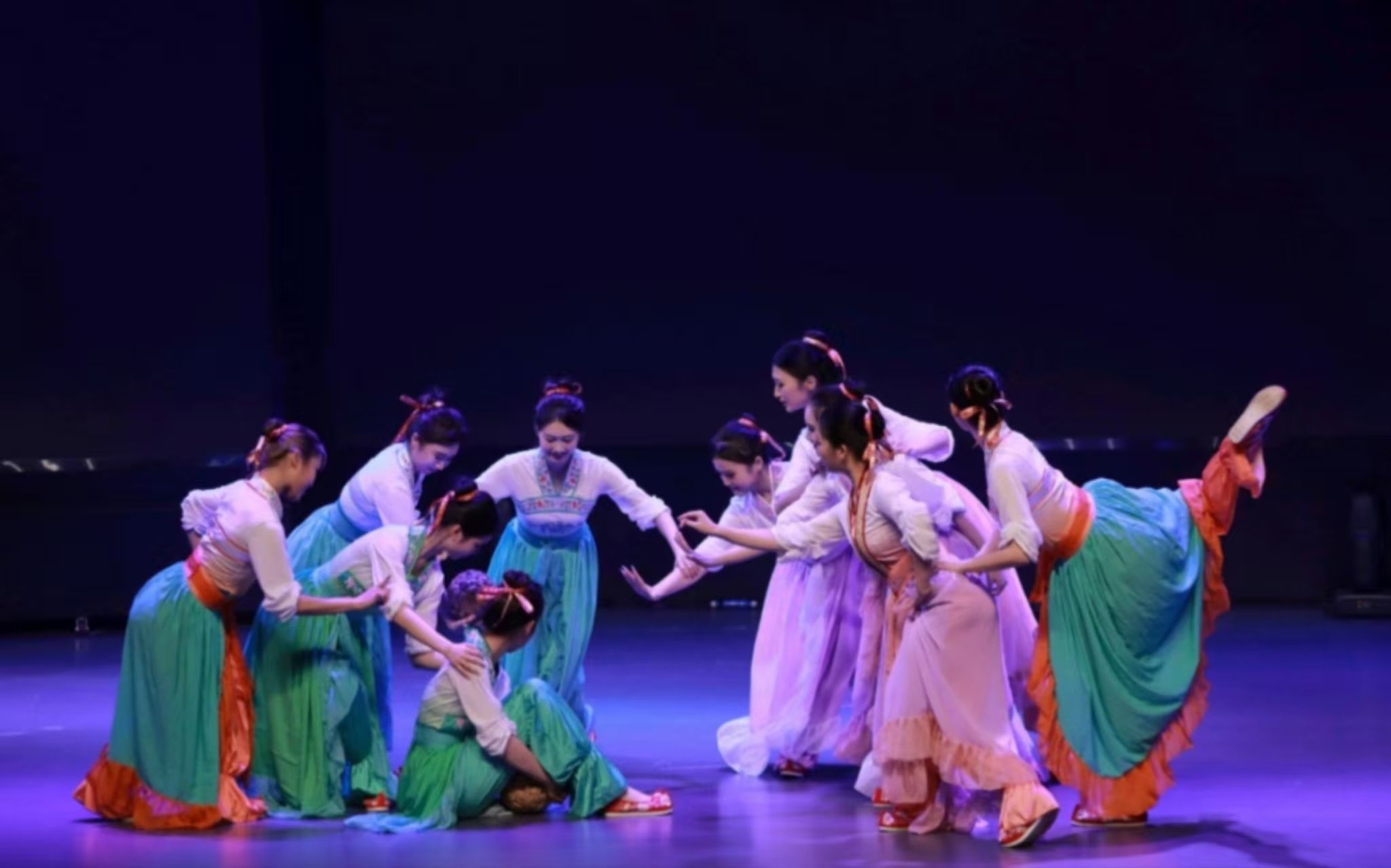 于“昨天”板块中,“蹴鞠情”被巧妙贯穿于蒙古族、傣族、维吾尔族、花鼓灯、山西小花戏等各民族民间韵律中,古老的体育智慧在当代舞韵中焕发新生,生动诠释了“体艺融合”的创新魅力,演绎为“各美其美,美美与共”的文化交响。那饱含深情的肢体语言,诉说着对中华优秀传统的热爱,更凝聚着深厚的如同石榴籽般的民族情深。这不仅是技艺的展示,更是思政育人的生动课堂。在艺术的熏陶下,铸牢中华民族共同体意识,共同描绘团结奋进的“同心圆”。每一个舞步、每一抹色彩,都是同学们在思政引领下淬炼的成果。在蹴”的活力、“绘”的斑斓、“舞”的韵律中,感受思政与艺术交融的魅力,共同见证着这份属于新时代的青春答卷!
