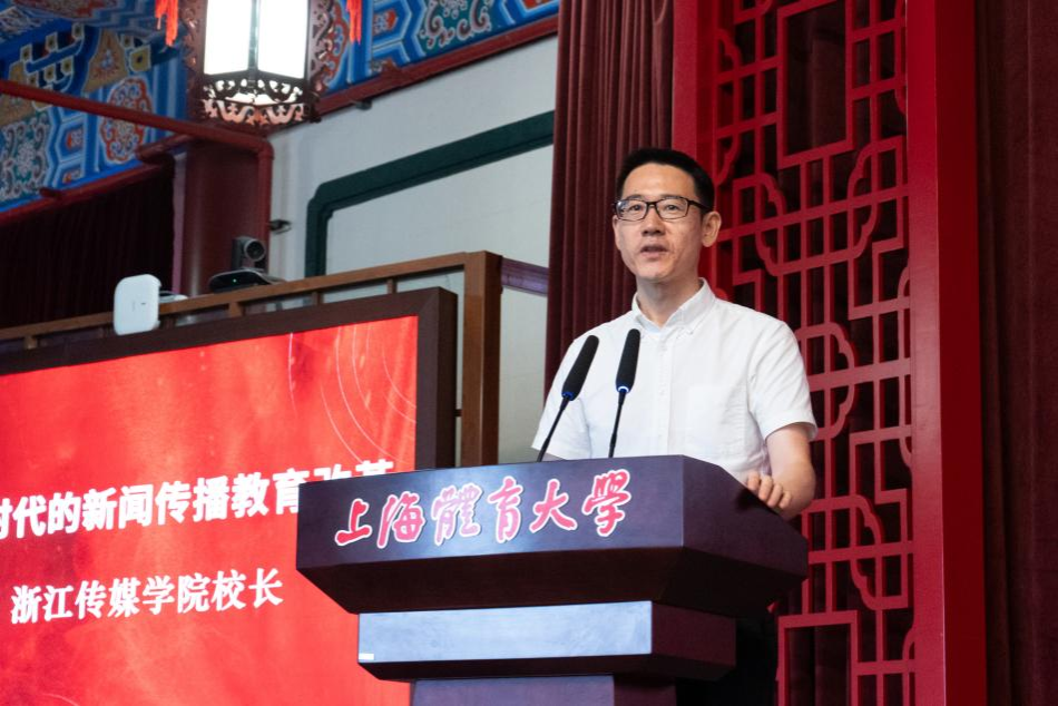 在主旨报告环节,浙江传媒学院校长韦路以“人工智能时代的新闻传播教育改革”为主题,提出AI时代的体育新闻教育需从“专业优化”入手,打破传统边界,关注电竞、体育数字传播等新兴领域,将AI技术全方位融入教学、科研、管理、评价环节,打造“未来课堂”。