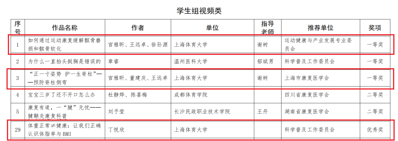 由伟德运动健康学院谢树老师指导、23级本科生官雅昕、董建庆和24级本科生王远卓、徐孙源等人创作的2个视频参赛作品《如何通过运动康复缓解髌骨磨损和髌骨软化》、《“正一寸姿势 护一生脊柱”——预防脊柱侧弯》均获得学生组视频类一等奖,运动健康学院22级本科生丁悦欣创作的视频作品《体重正常≠健康:让我们正确认识体脂率与BMI》获得学生组视频类优秀奖。