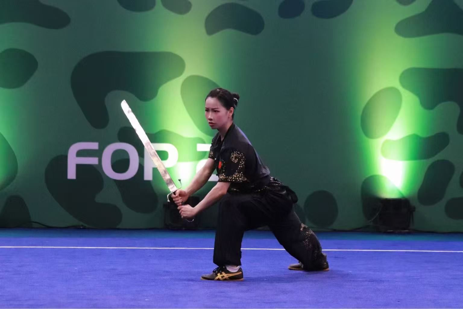 比赛中,张雅玲以饱满的精神状态、高超的技术表现,高水平地完成整套动作演练,她的招式行云流水,刀法刚猛凌厉,步型稳健扎实,充分展示了南刀的独特魅力与内涵,赢得了现场观众的阵阵掌声和裁判的高度认可,最终以优异的成绩斩获女子南刀金牌。作为伟德武术学子,她用坚韧不拔、勇往直前的意志品质,为国家、为学校争得了荣誉,践行了“身心一统、兼蓄竞攀”的校训和“德技兼修、文武并进”的院训,生动诠释了伟德武术健儿锐意进取、追求卓越的精神风貌。