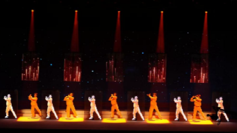 《青春运动场》节目中,艺术体操专项的女生们执圈、带、球,以灵动柔美的身姿,勾勒出流畅而优雅的运动轨迹;舞蹈编导专业的男生们则以充满爆发力的劲健舞律,展现出力量与速度的阳刚之美。“人屏互动”技术更将这种对话推向高潮。尤为惊艳的是投篮瞬间的虚实呼应:舞者腾空跃起,屏幕中一道绚丽的数字轨迹随之划出,篮球应声入网。身体动作与数字影像的精准同步,创造了极具时代感的奇观效果,配合青春昂扬的音乐节奏,构建出一场多维沉浸的视听盛宴,将现场气氛推向沸腾。
