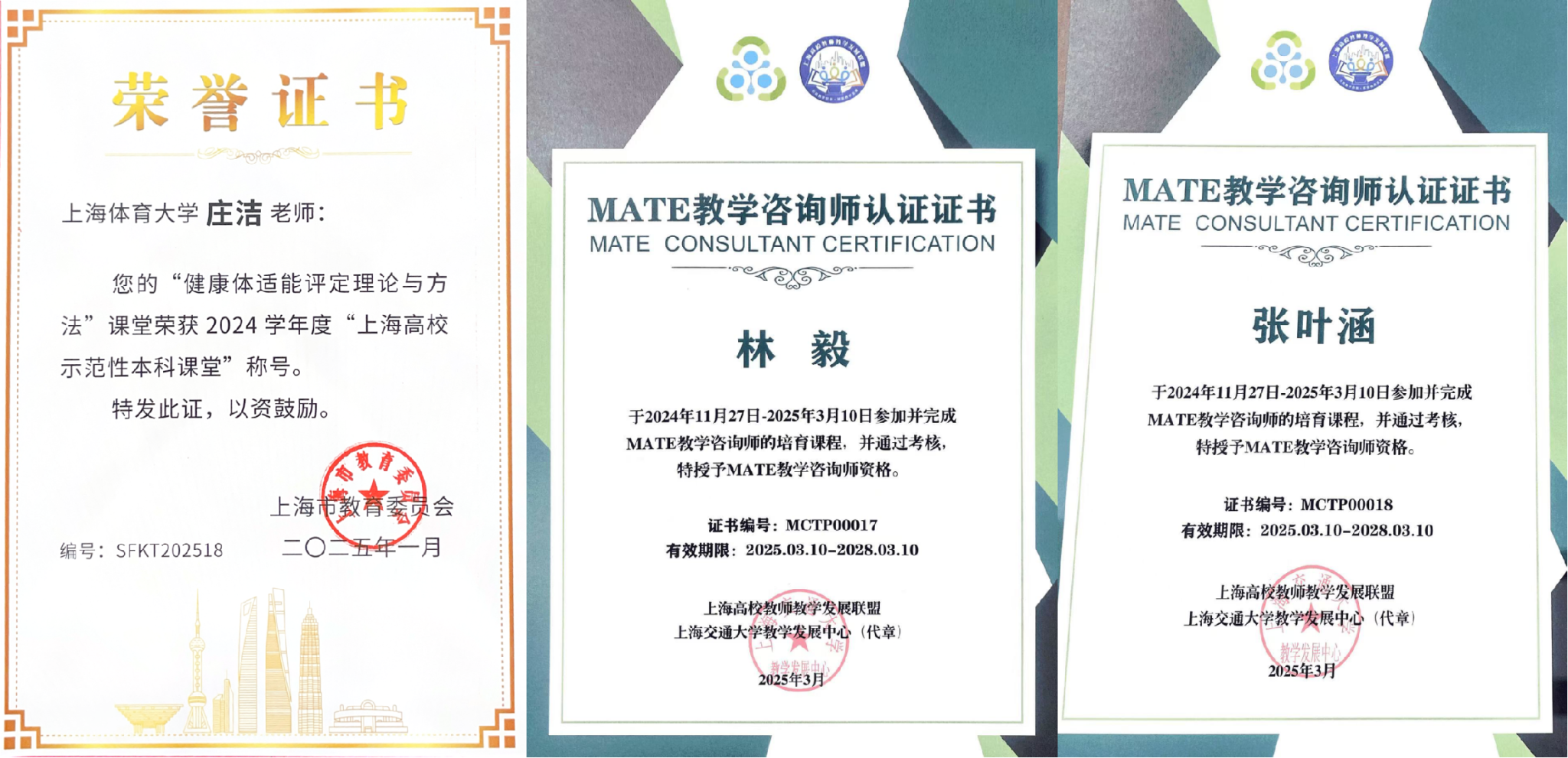 会议展示了第三届“上海高校示范性本科课堂”教学展示交流活动成果,伟德《健康体适能评定理论与方法》(主讲教师:庄洁教授)荣获2025年“上海高校示范性本科课堂”称号,学校获得“优秀组织奖”。张叶涵、林毅两位教师获得上海高校“MATE教学咨询认证师”资格证书。