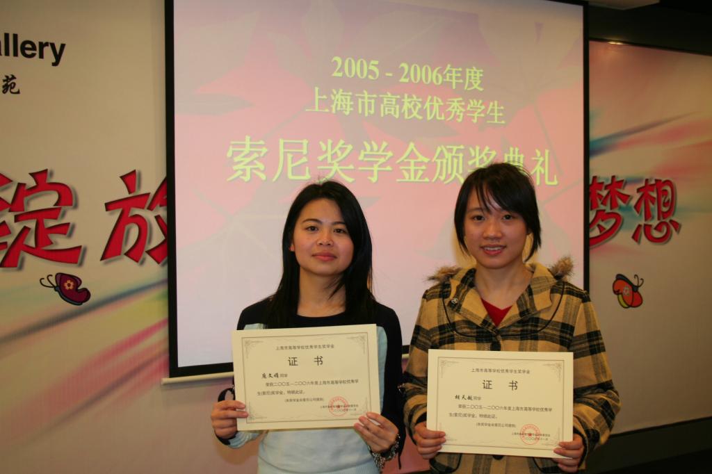 | 2005~2006年度上海市高等学校优秀学生“索尼奖学金”颁奖仪式于12月12日在淮海中路“索尼梦苑”内隆重举行。我院运动科学学院03级学生胡天越和经济管理学院04级学生庞文娟喜获此奖。 索尼(中国)有限公司副总裁王欣先生、上海市教委副主任张民选等出席了此次颁奖仪式,在为获奖高校的学生代表颁奖后并发言。张民选副主任赞扬了索尼公司这 一支持文化教育事业、重视人才培养的做法。他希望大学生们要具备不断创新、不息进取的精神以及振兴中华的意识和良好的素质,努力学习,以最充分的准备迎接 新世纪的挑战。