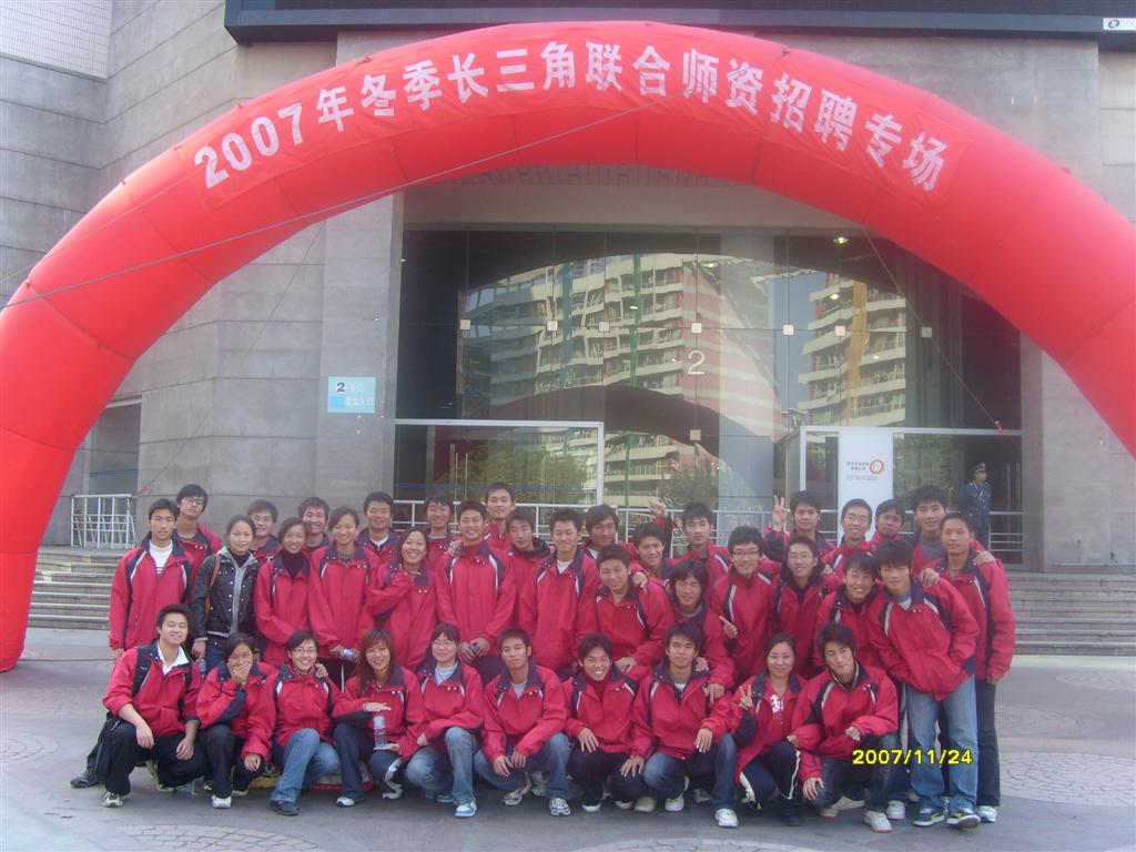 | 11月24日,2007年冬季长三角地区联合师资招聘会在光大会展中心拉开帷幕,体育教育专业40名学生在就业办王强老师和辅导员盛立恒的带领下,参与了该招聘会的志愿者服务。 在市教委教育人才交流中心负责人的安排下,40名学生被安排在会馆的出入口、服务台、内场等处,担当起发放入场券、验票、接待服务、内场安保、人群疏导的任务。由于求职者异常踊跃,从早上七点开始,展馆前已有人排队,八点左右,3000多人已经弯成了几条长龙。经历过女足世界杯、田径黄金联赛、特奥运动会等大型志愿者活动洗礼的志愿者们,坚守在各自的岗位上,有效的疏导了高峰时段人流,保障了会场的秩序,维护了会场的安全稳定。在持续近6个小时的工作中,志愿者们热情、高效、有序的为近20000人提供了优质服务,他们吃苦耐劳的奉献精神受到了市教委教育人才交流中心领导的高度评价。
