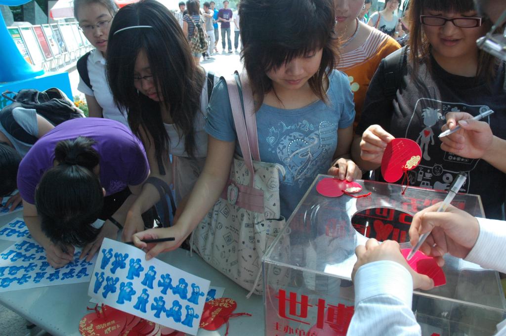 6月4日上午,在清源环路650号海宝塑像旁,学院工会组织了“寄语世博”签名留言活动。同学们在形态各异的蓝色海宝贴图上写下自己的名字,并在心形的红色卡片上写上了对世博会的寄语心愿,投进透明的“寄语世博心愿箱”中。一个个签有名字的蓝色海宝贴图,代表着一位位体院人对世博会的祝福,院工会的老师认真的把他们一个个摘下,再集中贴在一张大海报上,同学们兴致盎然,现场气氛热烈。院工会为过往同学发放了精美的《中国2010年上海世博会》知识宣传单,并赠送了由上海教育出版社出版的《上海迎世博市民读本》,该书图文并茂,可读性极强。寄语活动不仅吸引了过往同学,也引来热心的学院教工积极参与,他们签下名字,写下寄语,并在现场做起志愿者工作,为同学们发放宣传品和书籍。