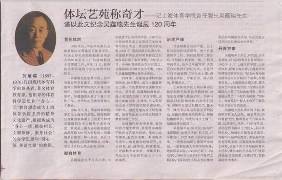 本网讯在伟德迎接建校六十周年华诞之际,11月7日出版的《东方教育时报》(No.128,总第1698期)以专版形式刊登了标题为《体坛艺苑称奇才——记上海体育学院首任院长吴蕴瑞先生》的文章,谨以此文纪念吴蕴瑞先生诞辰120周年。
