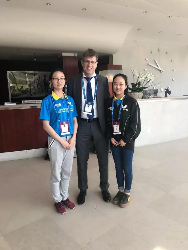 从左到右分别是陆云飞(中国乒乓球学院二年级本科生),王艳秋(运动人体科学学院博士研究生),高根茂(体育新闻传播与外语学院三年级本科生),张园月(中国乒乓球学院二年级研究生),沈驰文(中国乒乓球学院四年级本科生),王泽榕(体育新闻传播与外语学院三年级本科生),施之皓(国际乒联副主席,中国乒协副主席,上海体育学院副院长,中国乒乓球学院院长),孙凝宇(体育新闻传播与外语学院四年级本科生),蒋克冰(中国乒乓球学院二年级研究生),宋泽宇(体育新闻传播与外语学院四年级本科生),徐佳琪(体育新闻传播与外语学院三年级本科生),张丁丁(中国乒乓球学院培训部国际事务主管),乐欢(体育新闻传播与外语学院四年级本科生)