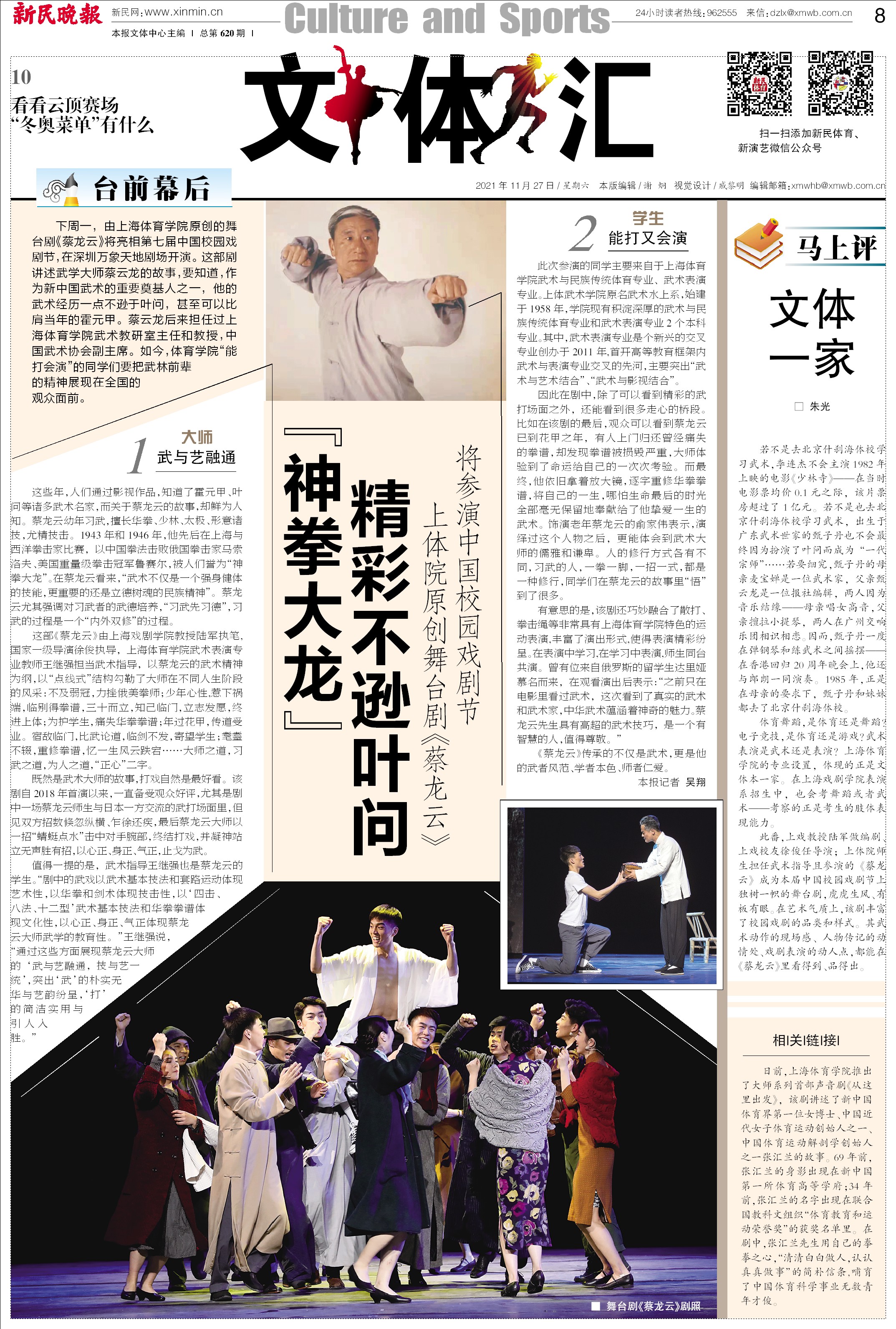 下周一,由上海体育学院原创的舞台剧《蔡龙云》将亮相第七届中国校园戏剧节,在深圳万象天地剧场开演。这部剧讲述武学大师蔡云龙的故事,要知道,作为新中国武术的重要奠基人之一,他的武术经历一点不逊于叶问,甚至可以比肩当年的霍元甲。蔡云龙后来担任过上海体育学院武术教研室主任和教授,中国武术协会副主席。如今,体育学院“能打会演”的同学们要把武林前辈的精神展现在全国的观众面前。