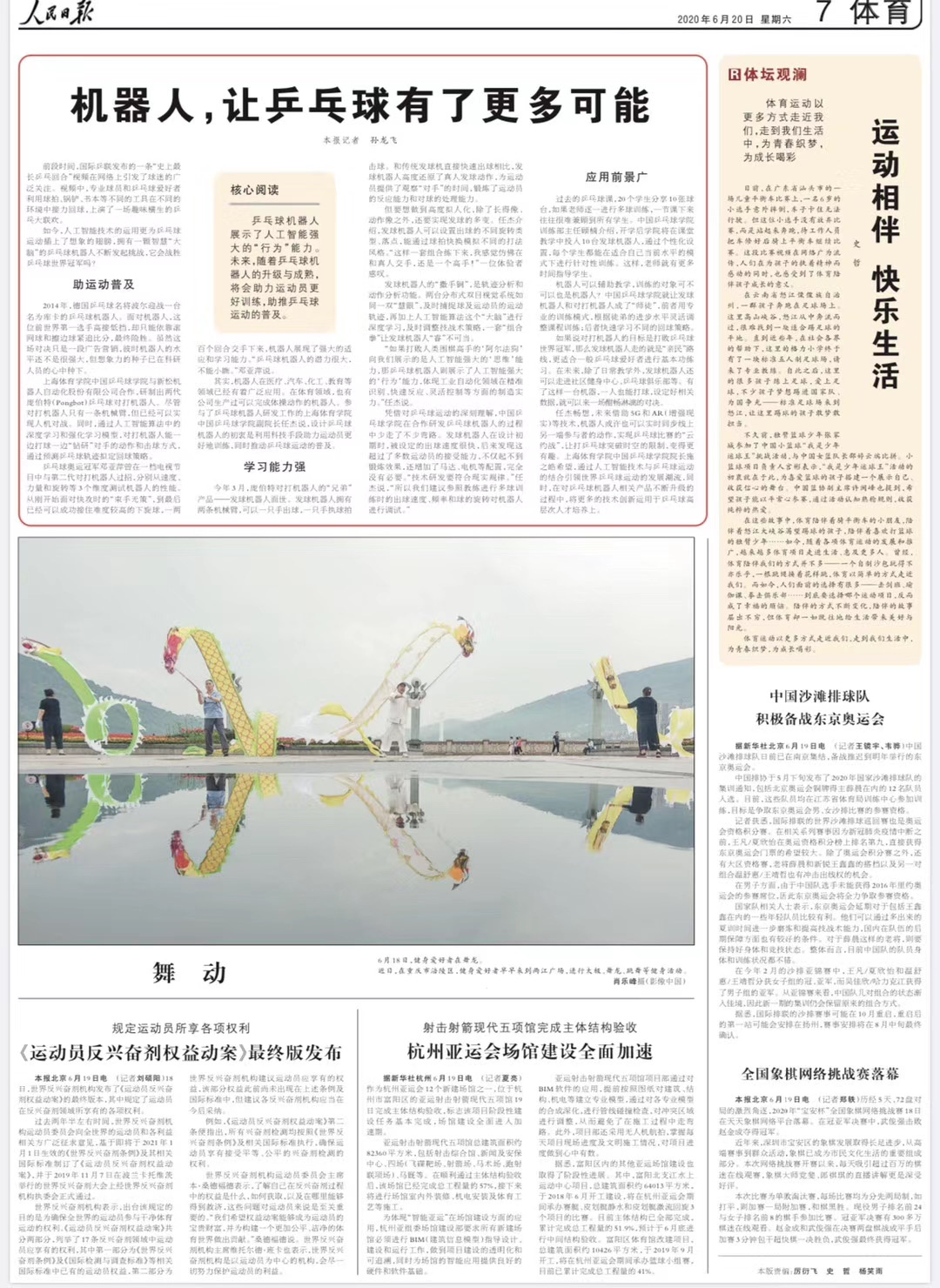 任杰畅想,未来借助5G和AR(增强现实)等技术,机器人或许也可以实时同步线上另一端参与者的动作,实现乒乓球比赛的“云约战”,让打乒乓球突破时空的限制,变得更有趣。上海体育学院中国乒乓球学院院长施之皓希望,通过人工智能技术与乒乓球运动的结合引领世界乒乓球运动的发展潮流,同时,在对乒乓球机器人相关产品不断升级的过程中,将更多的技术创新运用于乒乓球高层次人才培养上。